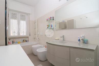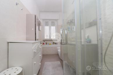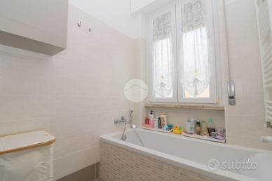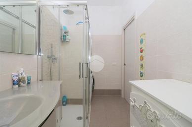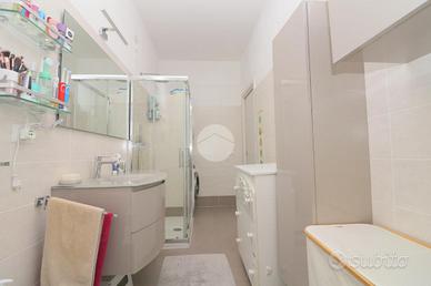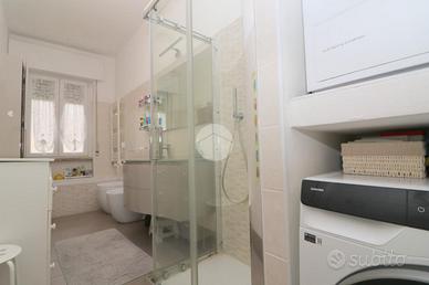 Il bagno è spazioso ed al suo interno un angolo lavanderia permette di combinare nel modo più ottimale possibile funzionalità ed eleganza.