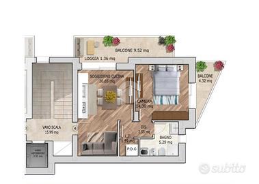 L'ingresso conduce direttamente al soggiorno con cucina a vista, caratterizzato da ampie vetrate che permettono l'ingresso di luce naturale durante tutto il giorno.