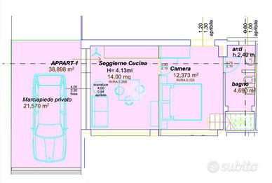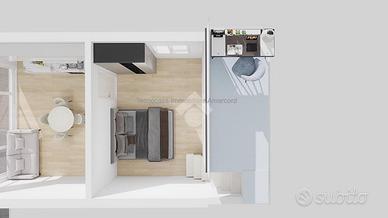 Ingresso indipendente su luminoso soggiorno con ampia vetrata di 4 m e angolo cottura. Camera da letto matrimoniale, dalla quale si accede ad un area soppalcata di 4mq. Soggiorno e camera godono di un altezza di 4m garantendo uno spazio luminoso e arioso. Bagno finestrato con box doccia. Corte esterna privata di 20 mq dove è possibile parcheggiare l'auto.