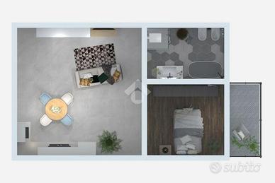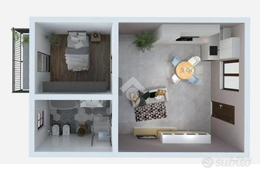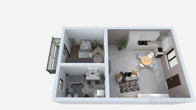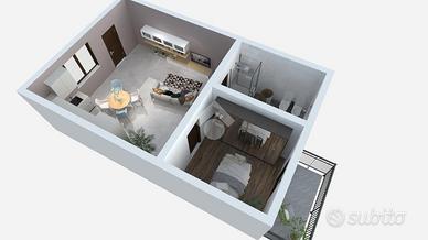 L'appartamento sarà così composto: ingresso direttamente nel soggiorno con cucina a vista. Proseguendo sulla destra, ci sarà la camera matrimoniale con balcone e sulla sinistra il bagno finestrato con vasca e box doccia.