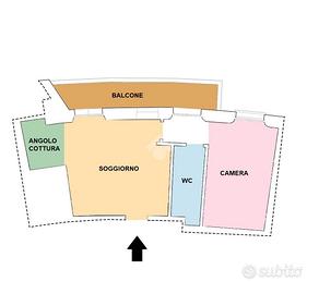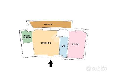 All'interno dell'unità immobiliare l'ingresso è open nella zona living con cucinotto, peculiare finestra a forma di oblò e porta finestra di accesso al balcone perimetrale di 8 mq. Vi è un disimpegno che separa la zona giorno dalla zona notte; da questo si accede al bagno, completo e dotato di box doccia e alla camera da letto,al balcone perimetrale.