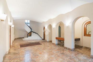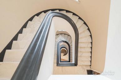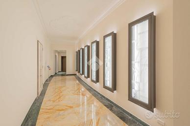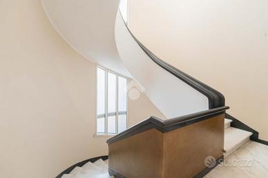 Vi è una galleria che consente l'accesso all'immobile in vendita, elegantemente impreziosita dalle vetrate di Del Debbio, collocate tra pannelli con illuminazione ottenuta tramite strip led arretrate rispetto alle vetrate.
