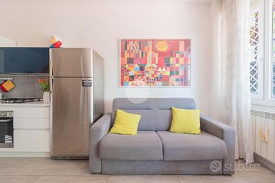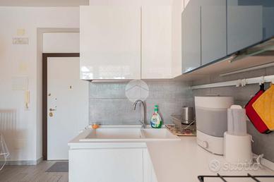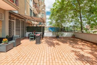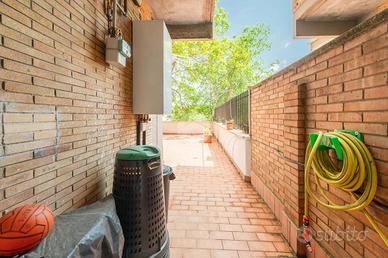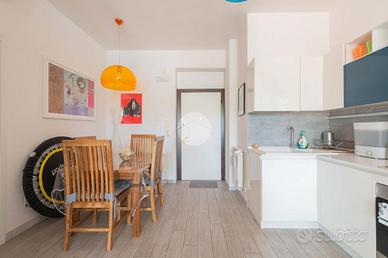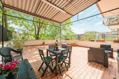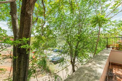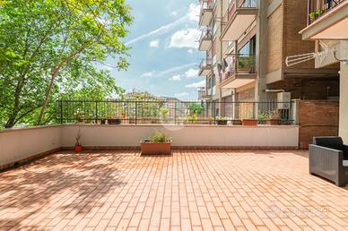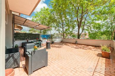 L'immobile è composto da luminoso e regolare soggiorno con armoniosa cucina a vista e portafinestra che conducono all'ampio terrazzo di 70 mq esposto ad Est. Un disimpegno collega la zona giorno alla zona notte, composta da camera da letto dotata di finestra e portafinestra con accesso ad una parte più riservata del terrazzo ed infine il bagno completo con doccia e finestra.