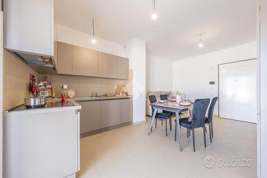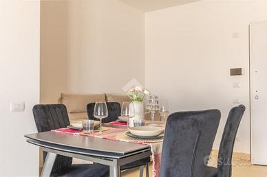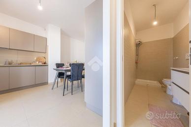 L'ingresso svela un luminoso salone, abbracciato dall'angolo cottura che invita a condividere piacevoli momenti conviviali e culinari mentre le finestre ampie permettono alla luce naturale di permeare gli spazi.