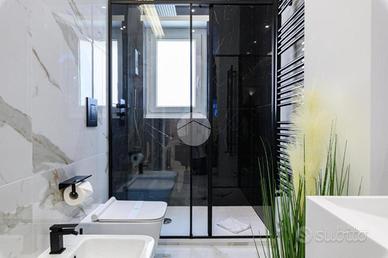 - Secondo bagno in grès effetto marmo bianco con venature dorate e grigie, dotato di doccia walk-in con cristallo trasparente, lavabo sospeso, specchio retroilluminato touch, sanitari sospesi, rubinetteria in nero opaco e luce ambientale soffusa per un'atmosfera spa.