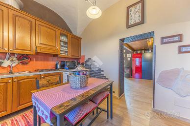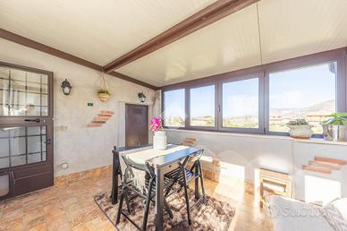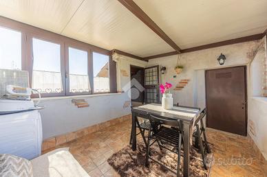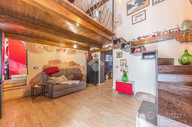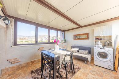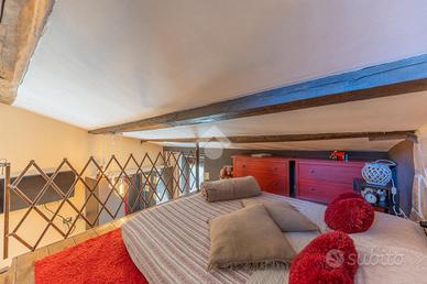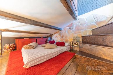 Una scala interna in legno conduce al soppalco abitabile, dove è stato ricavato un accogliente letto matrimoniale, ideale per sfruttare al meglio le altezze dell'immobile. Dal soppalco si accede a un terrazzo coperto, spazioso e riservato, ideale per pranzi all'aperto, serate con amici o semplici momenti di relax con vista aperta.