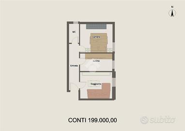 L'appartamento è composto da un ingresso, soggiorno, cucina semiabitabile, camera matrimoniale, disimpegno e bagno.