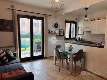 In edificio di recente costruzione, proponiamo la vendita di un appartamento composto da soggiorno a vista con angolo cottura, camera da letto, armadio a muro, bagno cieco con box doccia e impianto di aspirazione, ampio giardino, tramite ascensore si accede a box e cantina.