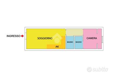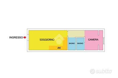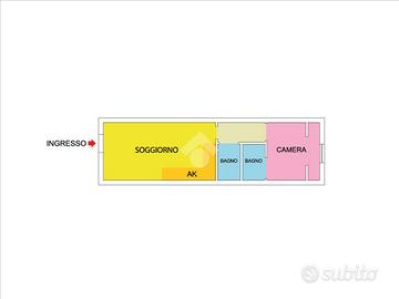 L'immobile è composto da ingresso che conduce alla zona giorno con angolo cottura, una camera da letto e due servizi, con finiture moderne e spazi ben distribuiti.