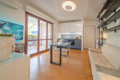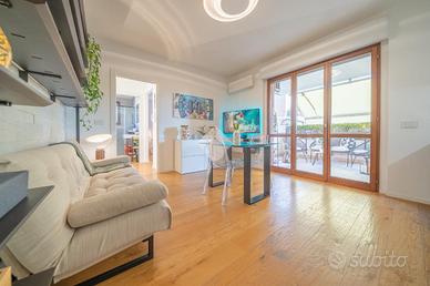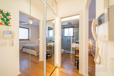 Un accurato disimpegno con armadiature specchiate su misura accompagna verso l'esterno, dove si apre il vero plus dell'abitazione: un ampio terrazzo coperto, completamente vivibile e riservato, arricchito da vasche siepe perimetrali, tende da sole e armadi tecnici che ospitano lavatrice e caldaia