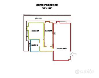 La tipologia costruttiva e la conformazione della pianta consentono una facile ridistribuzione degli spazi interni, rendendo l'immobile trasformabile in un comodo trilocale composto da soggiorno con angolo cottura, due camere e bagno.