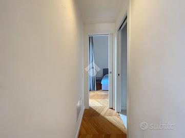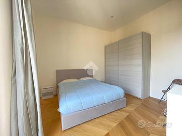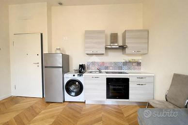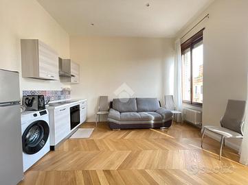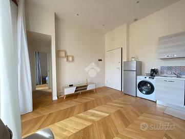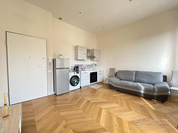 All'interno di un raffinato stabile, razionalista e dunque caratterizzato da volumi geometrici semplici e facciate lineari, proponiamo la vendita di un appartamento posto al terzo piano, caratterizzato da affacci silenziosi e riservati e assoluta luminosità. L'atrio di accesso all'unità immobiliare è imponente, prezioso e senza soluzioni di continuità rispetto alla corrente architettonica di costruzione dell'edificio, laddove dominano vetrate di Enrico Del Debbio. Internamente l'ingresso è aperto sul living con cucina a vista, e nello stesso ambiente sono presenti sia un'ampia finestra sia una porta finestra di accesso al balcone perimetrale di 8 mq. Un disimpegno consente di accedere al bagno, completo e dotato di ampio box doccia, e alla camera da letto, anch'essa con accesso al balcone perimetrale. L' immobile, nuovo e mai abitato, ha impianto di riscaldamento centralizzato, predisposizione per l'autonomo e per l'aria condizionata e piastre ad induzione.