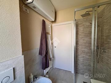 Un comodo disimpegno conduce alla zona notte, composta da una spaziosa camera matrimoniale, anch'essa molto luminosa, e da un bagno finestrato provvisto di box doccia.