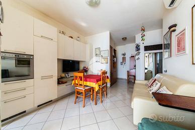Ingresso che si apre, subito davanti, nella LUMINOSA zona living con cucina a vista, dalla quale tramite porta finestra, si accede al comodo ed ampio balcone della casa, che corre lungo tutto il perimetro della soluzione immobiliare. Tramite piccolo disimpegno accediamo alla zona notte composta da un'AMPIA camera da letto matrimoniale finestrata con accesso al balcone ed affaccio sulla seconda esposizione e, bagno finestrato dotato di vasca da bagno.