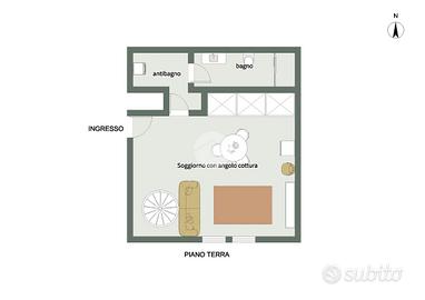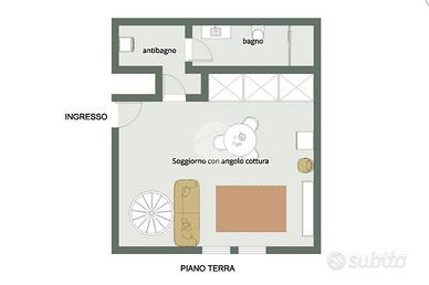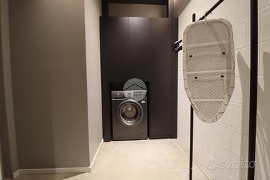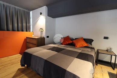 L'appartamento, completamente arredato su misura, si apre su una splendida zona giorno composta da ingresso soggiorno con angolo cottura moderno e attrezzato, antibagno con attaco lavatrice, bagno con finiture contemporanee, soppalco con elegante scala a chiocciola, dove si sviluppa la zona notte con letto matrimoniale
