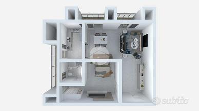 La cucina dispone anch'essa di un balcone, condiviso con la camera matrimoniale. Il bagno finestrato completa la proprietà, garantendo comfort e praticità.