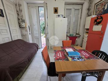 L'ingresso dalla porzione di cortile e giardino è diretto sulla zona giorno con parete cottura, quest'ultimo raggiungibile anche dalla scala condominiale.