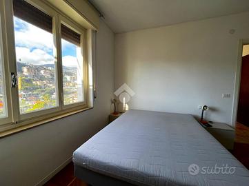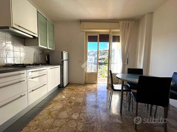 L'ingresso si apre su un pratico disimpegno che conduce alla zona giorno con angolo cottura, uno spazio accogliente e ben distribuito. Da qui si accede al balcone, vero punto di forza dell'abitazione: la vista è ampia e ariosa, spazia dal mare fino ai monti, regalando luce naturale durante tutto l'arco della giornata e un piacevole senso di apertura.