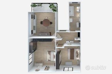 L'appartamento è composto da ingresso, cucina abitabile, due camere, un bagno, due ripostigli e balcone.