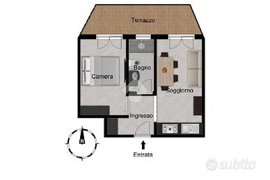 L'alloggio si apre direttamente sul soggiorno con angolo cottura, la camera da letto è matrimoniale e il bagno finestrato con box doccia.
