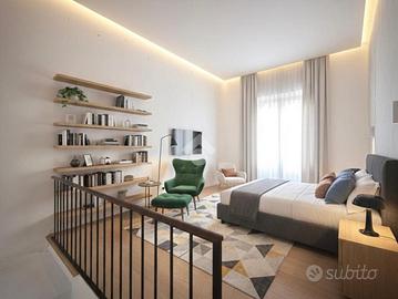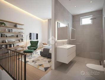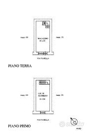L'immobile si sviluppa su due livelli, suddivisi in 35 mq per piano. Al piano terra si ha una grande vetrata che funge anche da ingresso garantendo luminosità, mentre al piano superiore troviamo un ampia stanza.