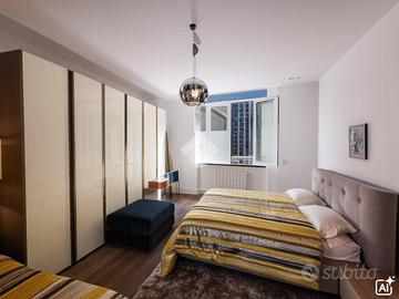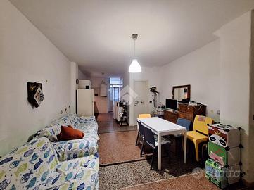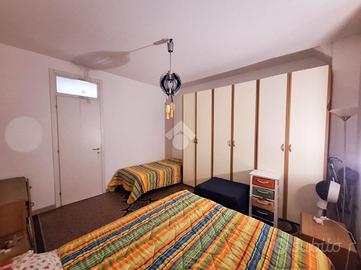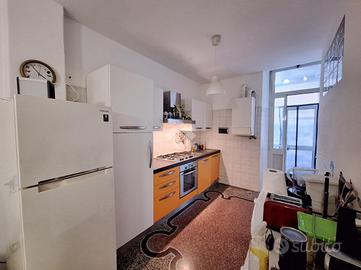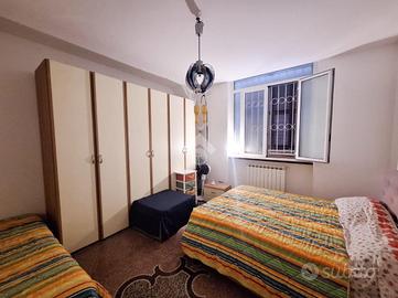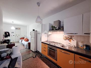 L'ampia camera matrimoniale consente di collocare agevolmente un letto matrimoniale, un lettino aggiuntivo e un capiente armadio, offrendo così comfort e funzionalità. Il bagno, rifinito in marmo chiaro, dispone di doccia e di un elegante angolo in vetrocemento che regala luce naturale. La pavimentazione alla genovese, uniforme in tutti gli ambienti, conserva il fascino originale della casa.