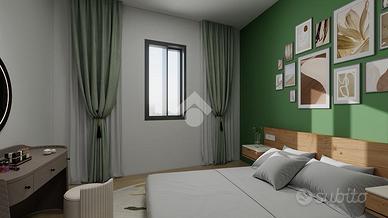 Tramite una scala esterna si accede alla zona notte della soluzione composta da camera matrimoniale, bagno con box doccia e finestra e piccolo studio.