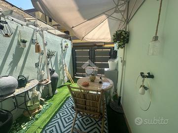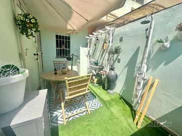 L'ingresso si apre su una zona giorno con angolo cottura, luminosa e ben organizzata, dalla quale una porta finestra conduce direttamente al cortile privato, curato dai proprietari e adibito a piacevole zona relax, perfetta per godersi momenti all'aria aperta in totale riservatezza.