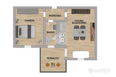 L'immobile, al quarto piano di una palazzina fornita di ascensore, si compone di soggiorno con angolo cottura a vista, camera da letto matrimoniale e servizio igienico finestrato con box doccia.