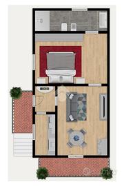 Varcando l'ingresso, un disimpegno introduce gli ambienti della casa, permettendo una distribuzione ordinata e pratica degli spazi. Sulla destra si trova il cucinotto, raccolto e funzionale, perfetto per chi ama cucinare in un ambiente dedicato e ben organizzato.