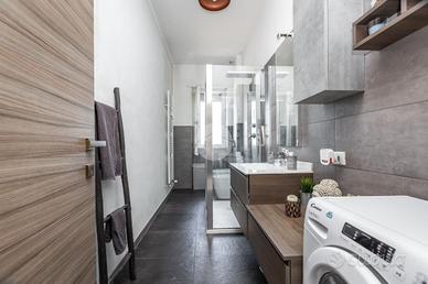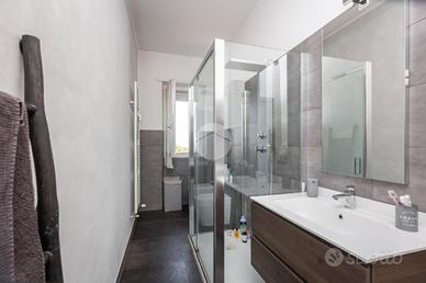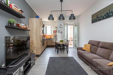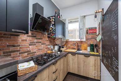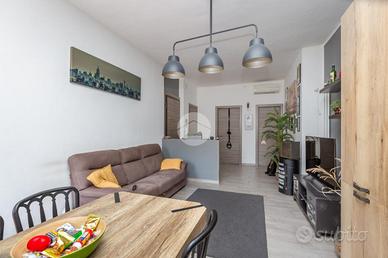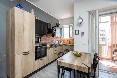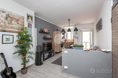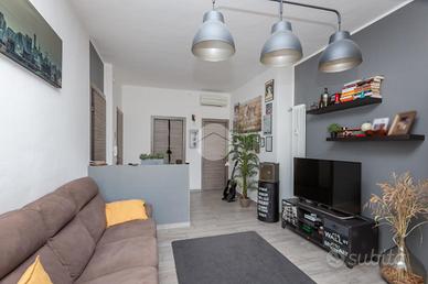 Il palazzo è in buone condizioni nelle parti comuni ed è ha l'ascensore. La casa è posta al sesto piano ed è ha una doppia esposizione. L'immobile internamente è stato completamente ristrutturato. L'accesso avviene tramite un portoncino blindato che si affaccia sulla zona living con cucina a vista. La zona giorno ha un climatizzatore ed affaccia sull'interno cortile grazie al balcone verandato. La camera da letto è ampia ed è esposta sulla via anch'essa tramite balcone. Il bagno, con doccia, ha la finestra. A disposizione della casa c'è un ripostiglio. Tutti gli infissi esterni sono in pvc e dotati di zanzariere. La proprietà dispone di una cantina al piano interrato. Il riscaldamento è centralizzato con termo valvole.