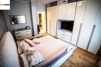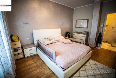 La camera da letto è spaziosa e ben squadrata, con pavimentazione in gres porcellanato color legno, che conferisce un tocco di eleganza e calore all'ambiente.