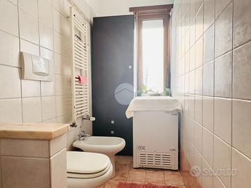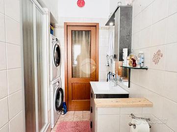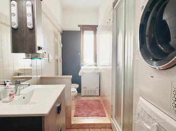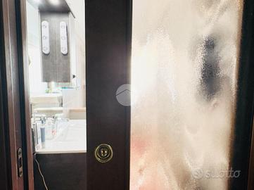 Il bagno, finestrato e provvisto di box doccia, è l'unico ambiente con pavimentazione diversa rispetto al resto dell'abitazione, dove invece troviamo un rivestimento uniforme che dona continuità e armonia agli spazi. Gli infissi in PVC effetto legno con doppio vetro, insieme alla porta blindata e alle eleganti porte scorrevoli in vetro/legno satinato, completano una dotazione moderna e di qualità.