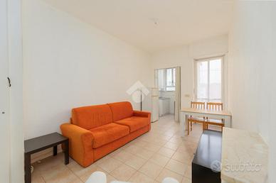 Dall'ingresso si accede alla zona giorno dotata di cucinino. Proseguendo troviamo una camera da letto matrimoniale ed il servizio finestrato.