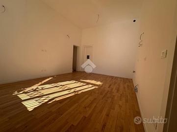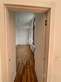 L'ingresso all'alloggio avviene da un caratteristico corridoio ad 'arco' che conduce alla zona giorno, la quale risulta ben esposta al sole e gode di una piacevole vista sul verde della corte alberata. All'interno di questo ambiente sono già presenti gli allacciamenti necessari a predisporre un angolo cottura a induzione, inoltre sarebbe possibile disporre un tavolo con quattro sedie, un ampio divano e tutte le armadiature necessarie a completare il soggiorno.