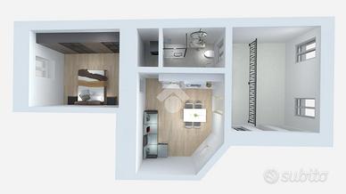 Al suo interno troviamo una zona giorno con angolo cottura e con accesso al terrazzino, il bagno completo con finestra e l'antibagno con attacco lavatrice e la camera matrimoniale.
