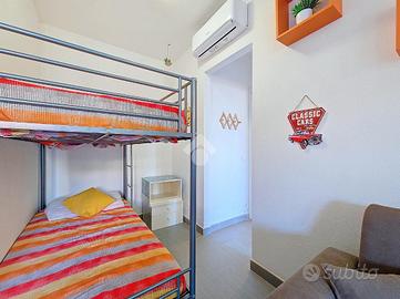 Dal portone blindato veniamo accolti nell'ampia e luminosa zona giorno con angolo cottura, dove grazie la metratura disponibile è stato posizionato un letto a castello per ricavare altri due posti letto.