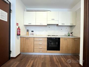 Ad accoglierci alla soluzione troviamo la zona giorno con cucina e soggiorno open space e accesso al grande giardino esposto a sud.