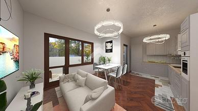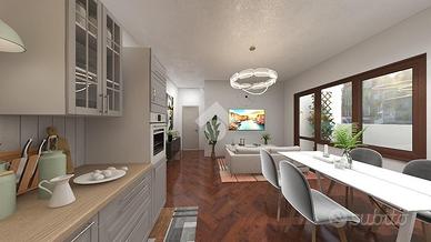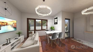 Entrando ci accoglie il soggiorno con angolo cottura in open space, due terrazzi che affacciano verso le nostre meravigliose montagne;