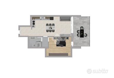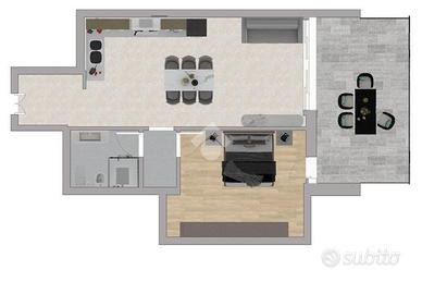 L'appartamento si presenta accogliente e ben organizzato: l'ingresso si apre su un soggiorno con angolo cottura che affaccia su un ampio terrazzo di 16 mq, ideale per godersi momenti di relax all'aperto.