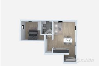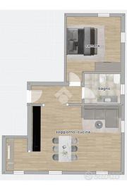 Dal vano scala comune accediamo alla luminosa zona giorno di 26 mq con cucina a vista; tramite un comodo disimpegno accediamo al bagno finestrato con box doccia e alla luminosa camera matrimoniale.