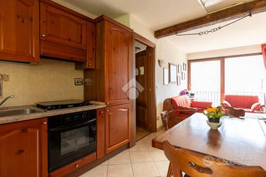 Gli interni sono curati e accoglienti. L'ingresso si apre direttamente sulla zona giorno in ambiente living, impreziosita dalla presenza di un caminetto e da una splendida vetrata scorrevole che, orientata a sud, regala una vista aperta sulla valle opposta. Da qui si accede a una balconata panoramica, sulla quale affaccia anche la camera da letto, creando una piacevole continuità tra gli ambienti.