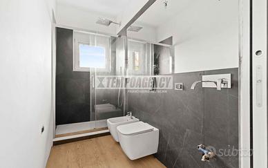 Bagno finestrato con box doccia, sanitari sospesi e nicchia dedicata alla lavanderia