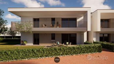 L' interno dell'abitazione presenta una zona living-cucina di 40 mq con affaccio direttamente sul porticato coperto e parco privato, un ampio disimpegno con possibilità di armadio a muro, 3 camere da letto, di cui 2 matrimoniali, due bagni entrambi finestrati. Completa la proprietà un garage doppio affiancato a piano scantinato e un posto auto esterno. Finiture pregiate di alto livello qualitativo in classe energetica A+++. Il residence sarà costruito con le più moderne tecniche costruttive, ponendo particolare attenzione all'isolamento termico ed acustico, dotato di impianti a basso impatto energetico!!