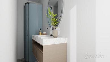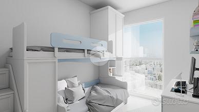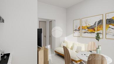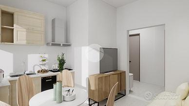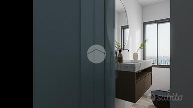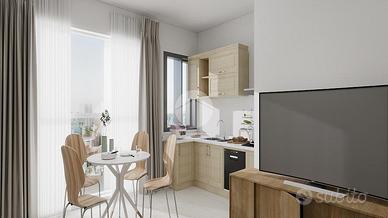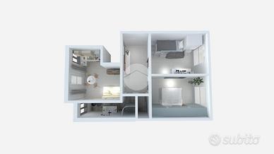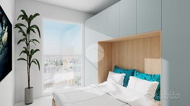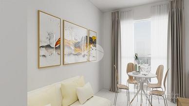 L'appartamento si apre su un ampio disimpegno che conduce alla zona giorno, composta da soggiorno con cucinino, con la possibilità di trasformare l'ambiente in un'unica zona living open space. Dal soggiorno si accede a un balcone che offre un piacevole sfogo esterno. La zona notte comprende due camere da letto, di cui una matrimoniale, entrambe con affaccio su balconi esterni.