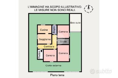 L'appartamento è così composto: ingresso su un corridoio luminoso, ampio soggiorno con cucina che porta alla corte esterna perimetrale, due camere matrimoniali , una stanza che può essere adibita a camera o a box auto e un bagno con vasca e finestra.