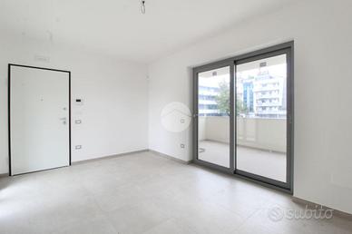 La soluzione è così composta: soggiorno con angolo cottura che affacciano su un terrazzo abitabile e un balcone, due camere e due bagni con box doccia e finestra.