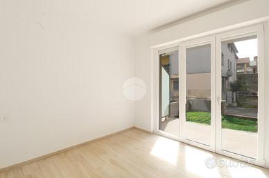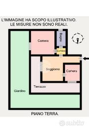 La soluzione è composta da: ingresso su luminoso soggiorno con cucina a vista ed accesso alla corte esterna con giardino perimetrale, disimpegno, due camere matrimoniali e bagno finestrato con box doccia.