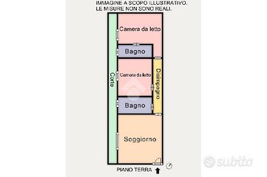 La soluzione è così composta: ingresso su soggiorno con accesso alla corte esterna; dal disimpegno si accede alla zona notte composta da due camere da letto matrimoniali, di cui una con bagno privato e accesso alla corte ed un bagno finestrato con box doccia.