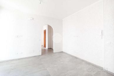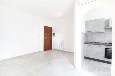 L'appartamento si apre su un luminoso soggiorno con cucinotto a vista, una soluzione moderna che favorisce la convivialità senza sacrificare l'ordine, i quali affacciano su un comodo balcone dotato di lavabo, perfetto per le necessità quotidiane.